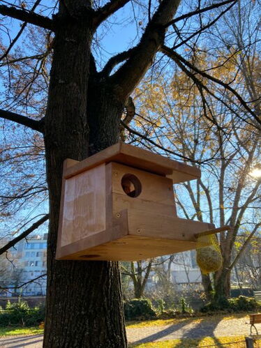 Jamie hat gemeinsam mit seinem Papa ein Häuschen gebaut, das sie anschließend mit einem Klassenkameraden an einem dort stehenden Baum angebracht haben. Nach wenigen Tagen fanden die ersten Tiere die neue gehaltvolle Futterquelle und nutzen diese nun regelmäßig.